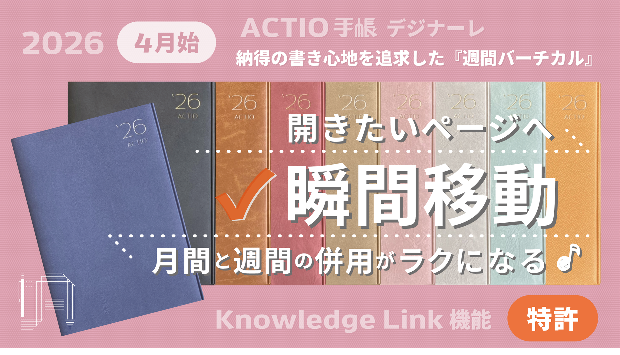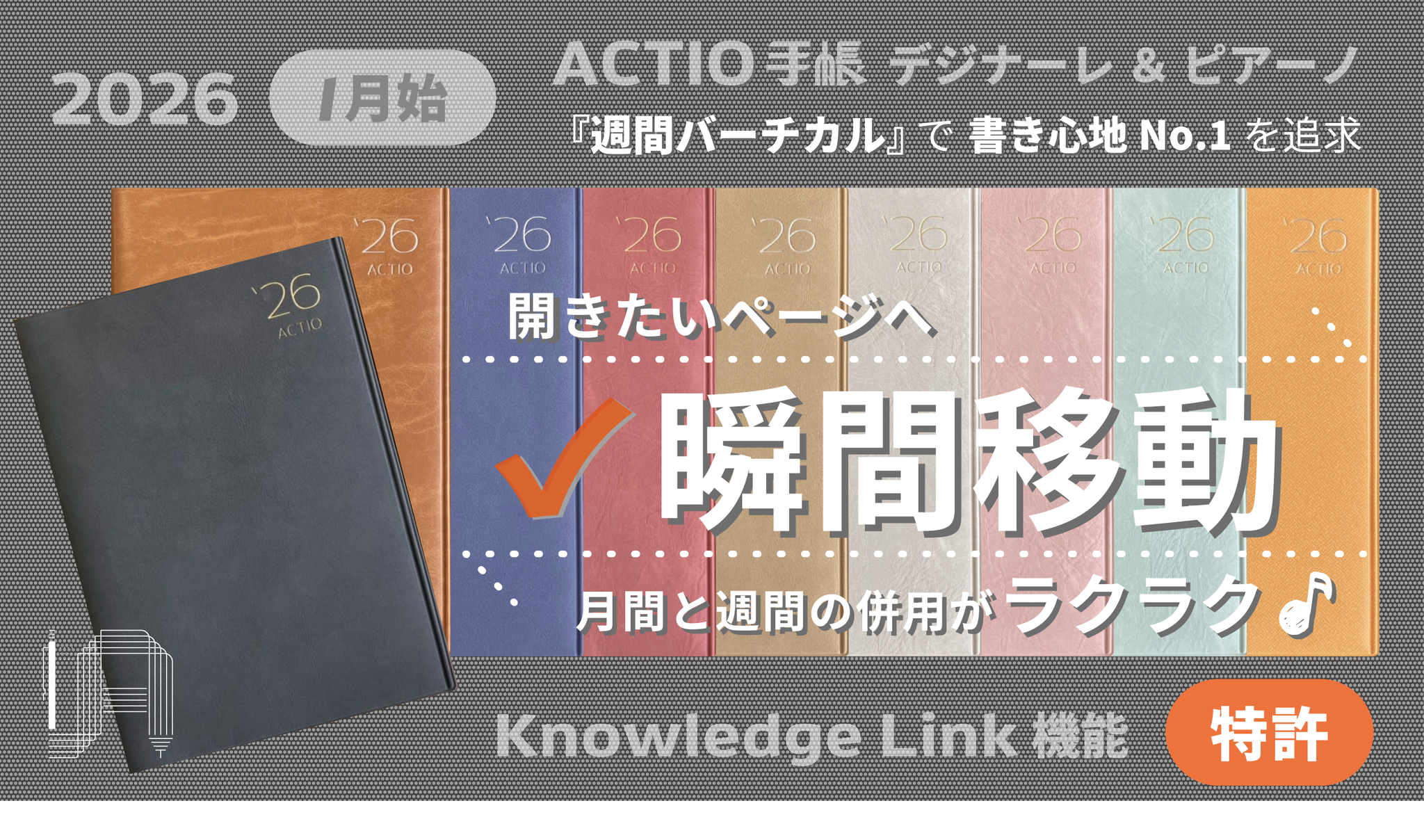 ACTIO手帳シリーズ独自の「各ページ間をスムーズに行き来できる」特許機能を動画でご覧いただけます。当機能は市販向け手帳にのみ採用されています。ただし、市販向け商品の中でも、当機能が未採用のプロダクトもございます。