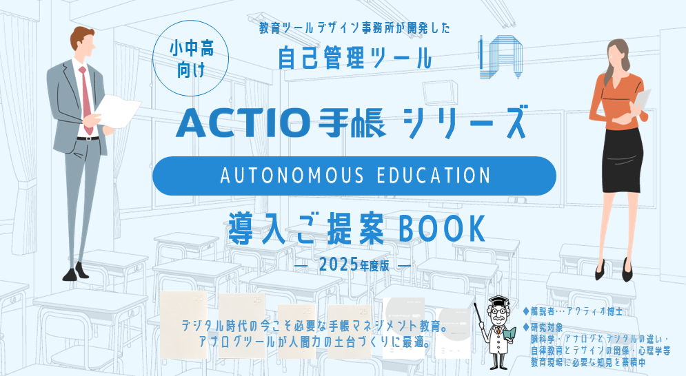 生徒様に手帳教育を通じて、「脳の成長に繋がるアナログ手帳に書くことの大切さを取り入れたい、デジタルに偏り過ぎない生活習慣・学習習慣を定着させたい、そしてメタ認知を高めながら自己管理能力の向上に繋げた指導を確立したい」とお考えの学校様におススメの自己管理ツール&運用法をご提案いたします。