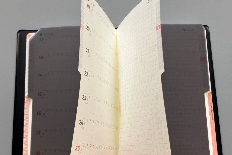 ・ダークグレーのような「クリアスモーク色」で、下敷きの上からでも書いた文字が視認できるため、先週や来週ページを捲って確認する際に、下敷きを敷いたままでも文字を確認いただけます。